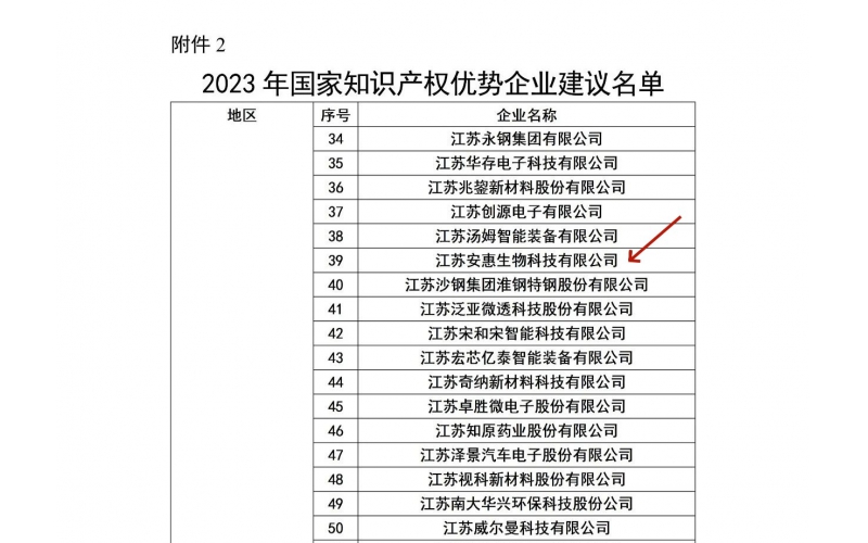2023年11月,國家知識產權局公布了2023年度國家知識產權優(yōu)勢企業(yè)名單,江蘇安惠生物科技有限公司榜上有名。